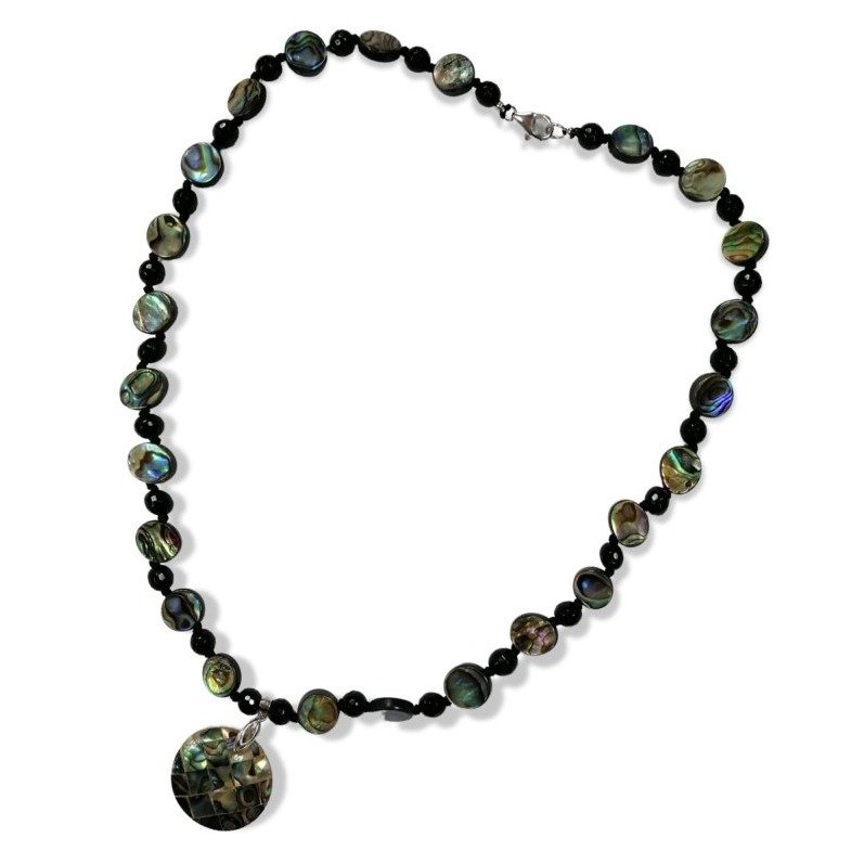 - Unique mix of polished black agate and vibrant abalone pendant.
