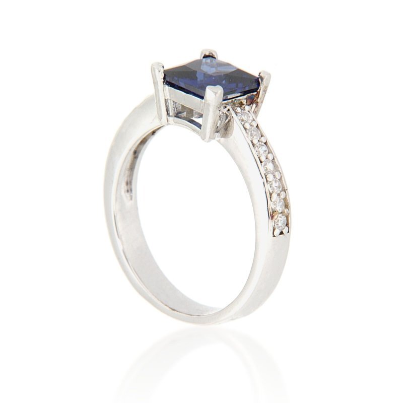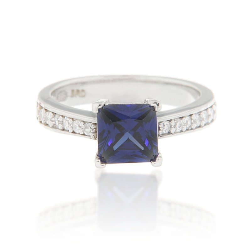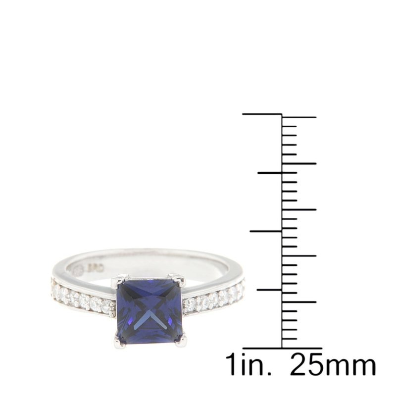 - Features a dazzling 7mm princess-cut Tanzanite blue CZ center stone