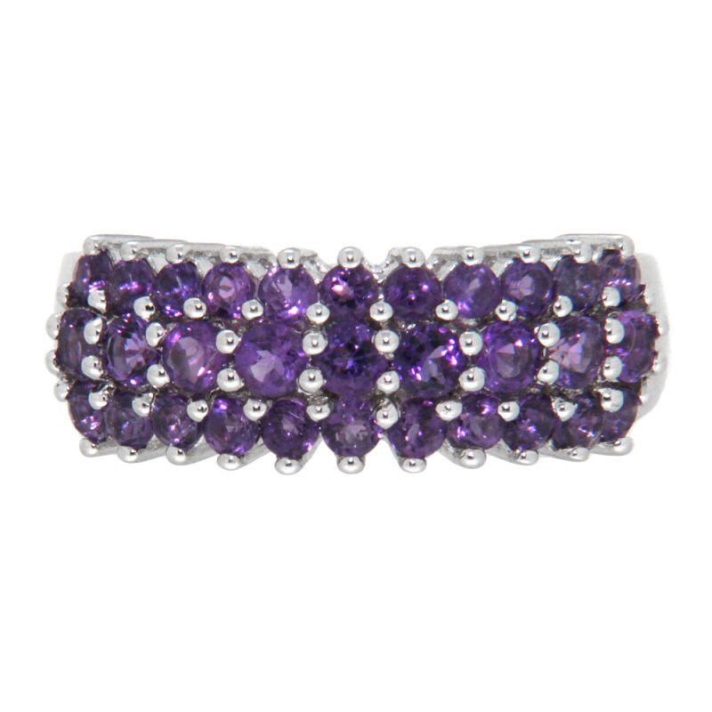 This classic Pearlz Ocean Amethyst Round Band Ring features three rows of stunning round-cut amethyst stones set in highly polished 925 sterling silver. The nine prong-set 2.5mm amethysts and twenty-two prong-set 2mm amethysts combine to create a vibrant, feminine look perfect for gifting or personal elegance.