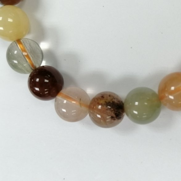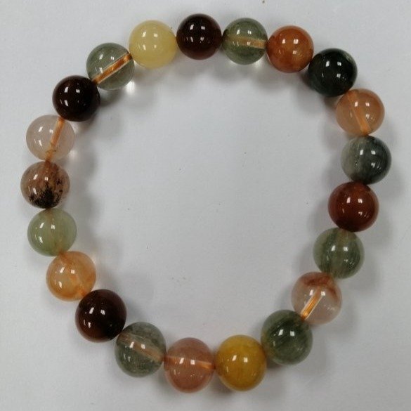 This beautiful bracelet features natural multi-colored rutilated quartz beads, each 10mm bead carefully refined for a smooth surface and stunning visual appeal. Known for symbolizing development, freedom, and well-being, rutilated quartz promotes goal-oriented thinking and enhances overall happiness. With a length of 7.5 to 8 inches and weighing approximately 28.6 grams, this bracelet is a meaningful and elegant addition to any jewelry collection.
